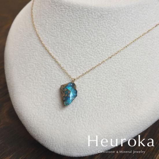 今回Heurokaでは 日の光に照らされて輝く海の色をした原石を選び、母岩にも磨きをかけジュエリーにいたしました。